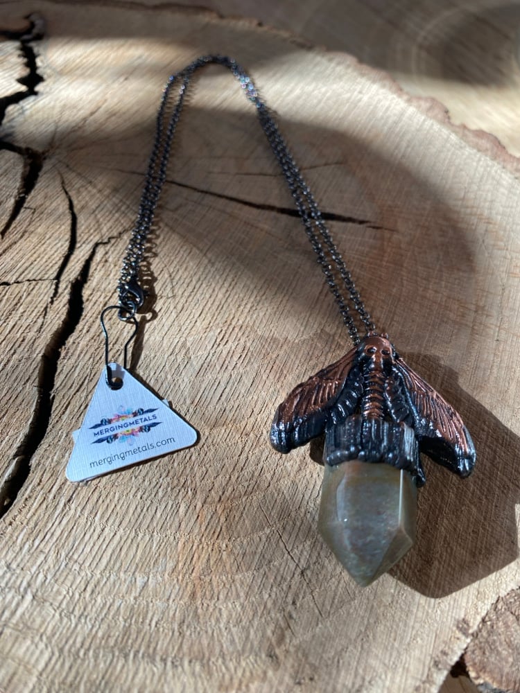 Death Head Hawk Moth complete on a 26” ball chain. Darkened copper pendants. Unisex.