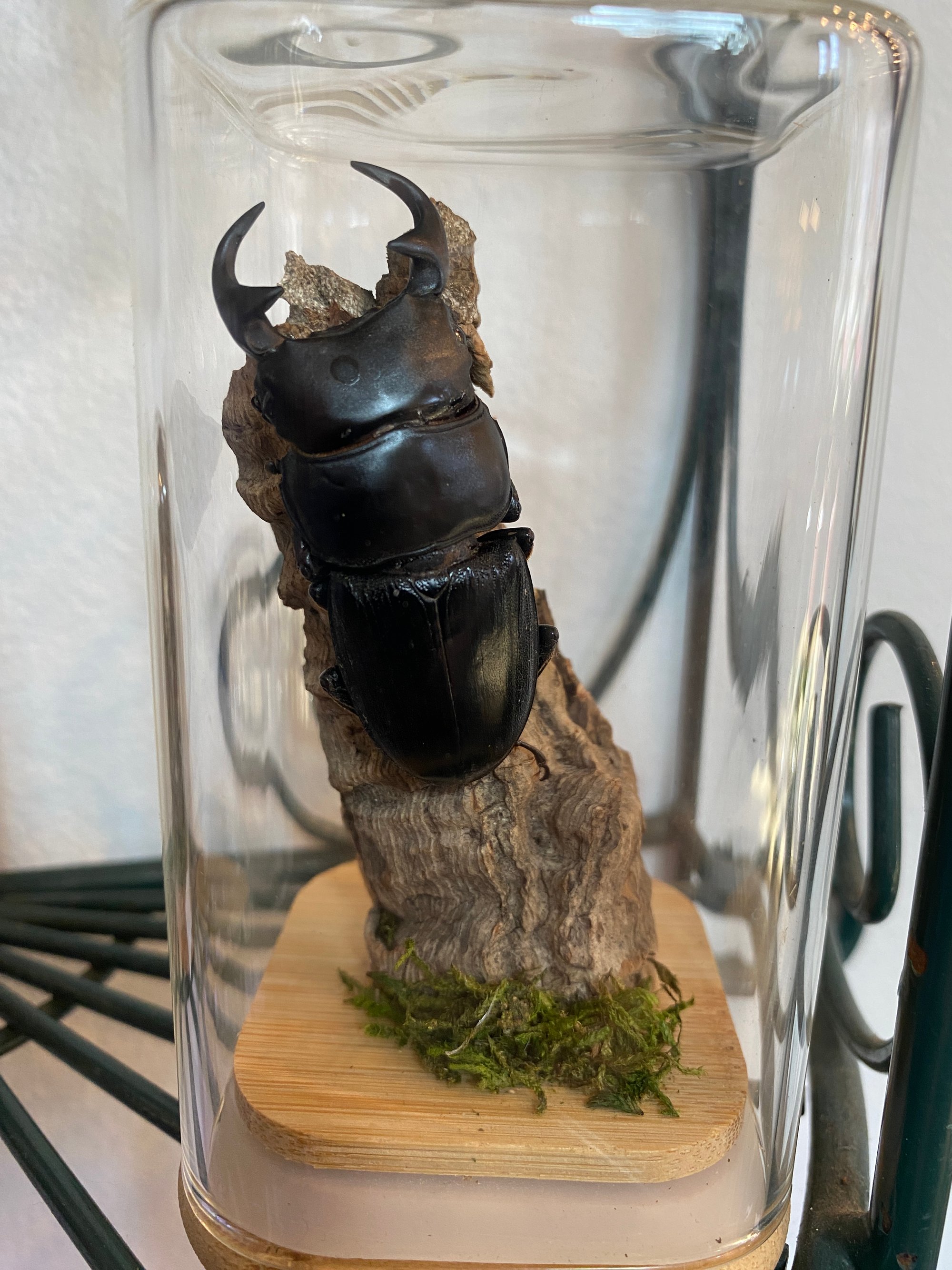 This preserved Dorcus ritsemae, also known as the Stag Beetle, is mounted on natural bark with a touch of dried moss and housed in a 4.5-inch square glass container. A grounded, altar-worthy specimen symbolizing strength, protection, and quiet resilience.